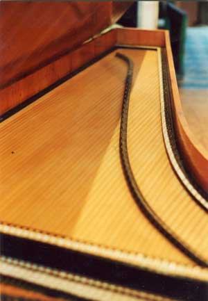 De binnenconstructie van deze pianoforte bestaat vooral uit vurenhout. Beuk en esdoorn zijn spaarzaam op de juiste plaats ingebracht.